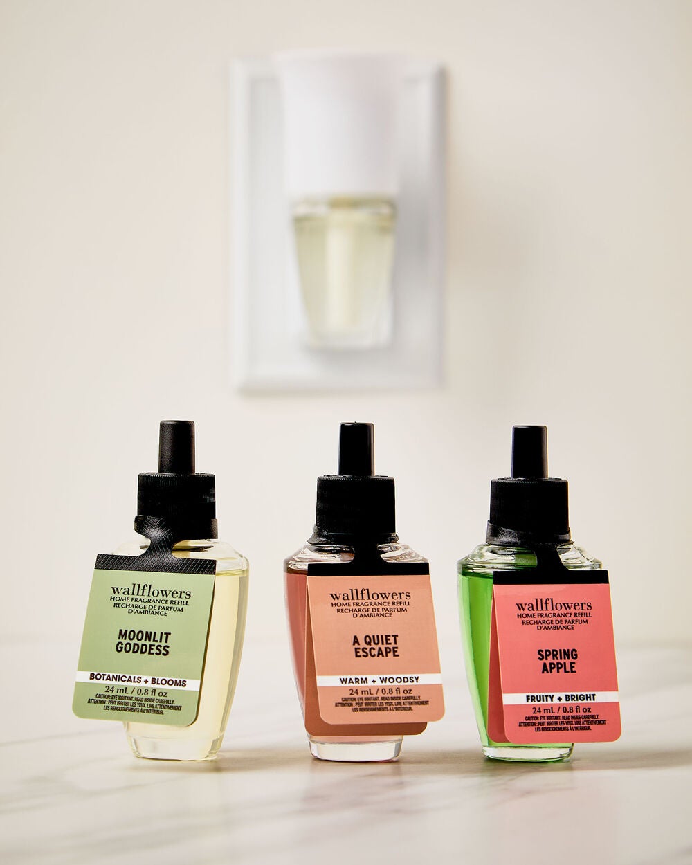 - Because Wallflowers refills contain fragrance oils that may damage finished surfaces and some plastics, always keep a 12″ clearance above your plug to prevent damage to surrounding surfaces.